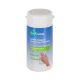 Contenitore apriechiudi con 100 salviette di pulizia per lavagna bianca. Realizzate con prodotti riciclabili, imbevute con detergenti biodegradabili e non tossici