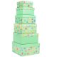 Robuste e colorate scatole in cartone spessore 2mm. Rivestite in carta da 170gr/m2 stampata in offset e incollata a caldo. Il set E' composto da 6 scatole, una per ogni misura: 12x12x6cm, 14x14x8cm, 16x16x9cm, 18x18x10cm, 20x20x11cm, 22x22x12cm.