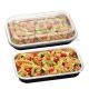 Contenitori in alluminio stirato laccati neri con coperchio trasparente in R-Pet ( con oltre 45% di PET riciclato ottenuto da macinato di bottiglie di plastica post-consumo. Idonei per forno tradizionale ed microonde grazie all'elevata rigiditA', conducibilitA' e resistenza meccanica/termica. Contenitore da 4 porzioni - 26,5x16,2x3,7cm.