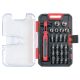 Cricchetto reversibile con soft grip da 1/4'' e portabits magnetico. Nr.6 bussole esagonali da 5 a 10mm. Inserti in acciaio cromo vanadio, nr.3 per viti con intaglio, nr.3 esagonale, nr.4 phillips, nr.3 pozidriv, nr.3 torx.
