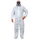 Tuta con cappuccio elasticizzata non tessuto (70% polipropilene 30% polietilene. Parte posteriore 100% polipropilene SMS molto traspirante. Chiusura zip sotto baverina. Elastico di chiusura in testa, in vita, ai polsi ed alle caviglie. 70% polipropilene 30% polietilene - non tessuto bianco. Il polietilene assicura una migliore resistenza alle aggressioni chimiche oltre che una migliore resistenza meccanica (abrasione - lacerazione. 100% polipropilene SMS - non tessuto arancione