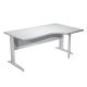 Scrivania compact destro sagomata con fianchi metal ad L verniciati effetto cromato. Spessore 22mm. Completi di canalina passacavi e piedini regolabili in altezza e supporto metal. Desktop con bordo anti urto in ABS da 2mm. Dimensioni: 160x60/80/100x72cm. Piano grigio.