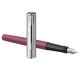 Penna stilografica con corpo rosa e cappuccio in acciaio. Pennino fine in acciaio inossidabile. Fornita con refill blu.