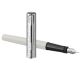 Penna stilografica con corpo bianco e cappuccio in color acciaio. Pennino fine in acciaio inossidabile. Fornita con refill blu.
