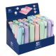 Buste portapenne in tessuto in 5 colori pastel con zip in tinta. Le buste sono dotate di un elastico in tinta che permette di agganciarle al quaderno. Assortiti in 3 formati: 6pz - large 8x21x7cm, 9pz - medium 7x21x4cm e 5pz - small 5x21x4cm.
