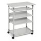 STRUTTURA IN ACCIAIO VERNICIATO CON POLVERI EPOSSIPOLIESTERE ANTIGRAFFIO E RACCORDI ANGOLARI IN PLASTICA RESISTENTE. REGOLABILE IN ALTEZZA AGGIUNGENDO ALLA STRUTTURA LE APPOSITE PROLUNGHE DA 20 CM (incluse. DOTATO DI 5 RIPIANI IN MELAMINICO SPESSORE 19 MM DI CUI UNO SCORREVOLE PER TASTIERA. I RIPIANI CENTRALI SONO REGOLABILI IN ALTEZZA. 4 RUOTE PIVOTTANTI DI CUI 2 BLOCCABILI. DIMENSIONI: L 750 X P 534MM - H 950/1150MM.